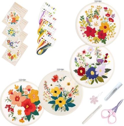SQIALOUN Embroidery kit for Beginners, 4 Sets Embroidery Kit for Beginners Adults and Kids with Patterns,Needle Point Kits Adults Beginner, Hand Embroidery Kit, Embroidery Starter Kit