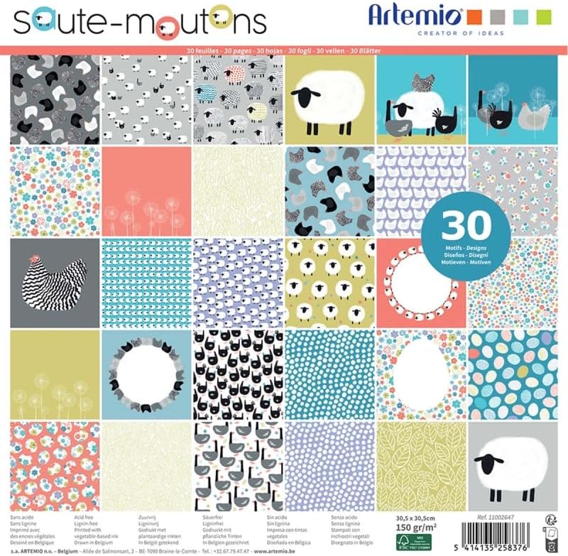 Scrapbook paper: ArtemioQuantity: 30 sheetsCollection: SheephopperModels: 30 different modelsDimensions: 30.5 x 30.5 cmGrammage: 150 g/m² Single-sided printingAcid and lignin freeCertification: FSC mixed paper › See more product details